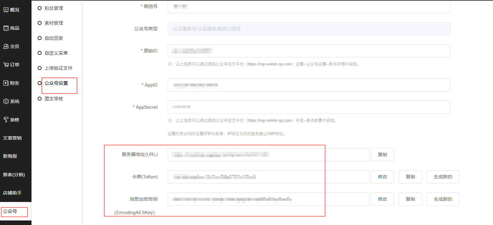 7:在商城系统后台-应用-公众号-设置,填写好在公众号后台记录好的信息