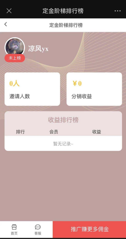 (2)用户可查看到通过该活动下定金的订单获取的一级分销奖金的由多到少排名的前100 位用户,初始显示6位,点击更多显示全部,最多100位
