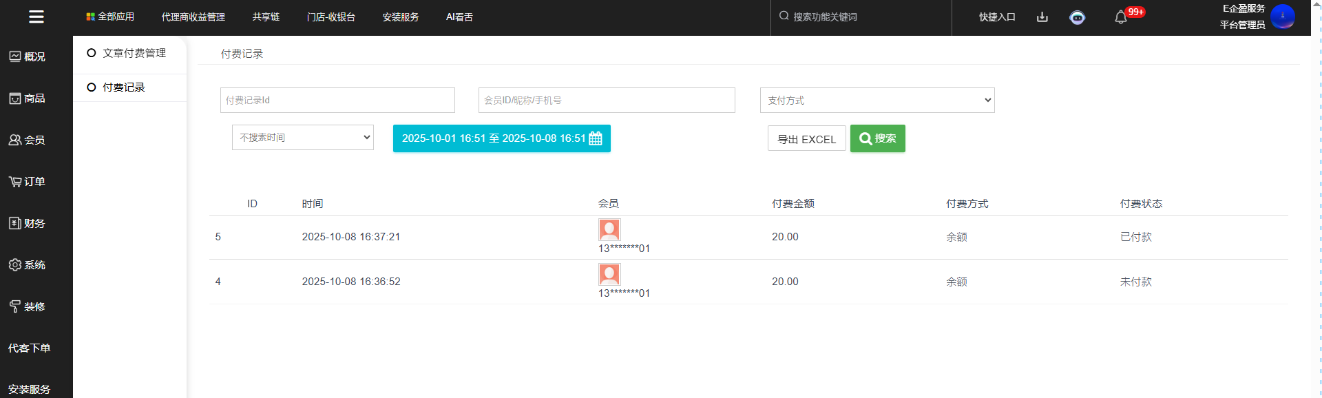 显示付费会员、付费时间、付费金额、付费方式、状态