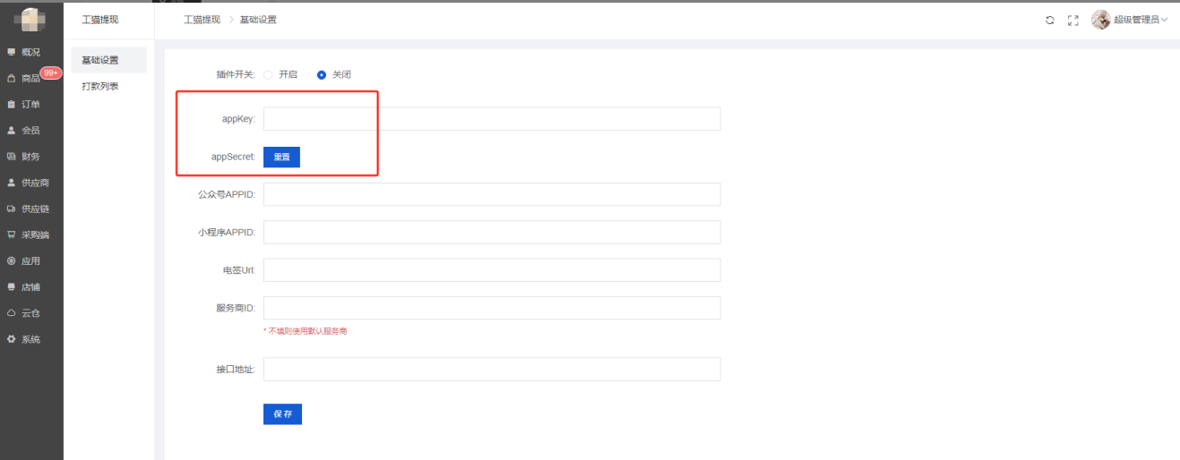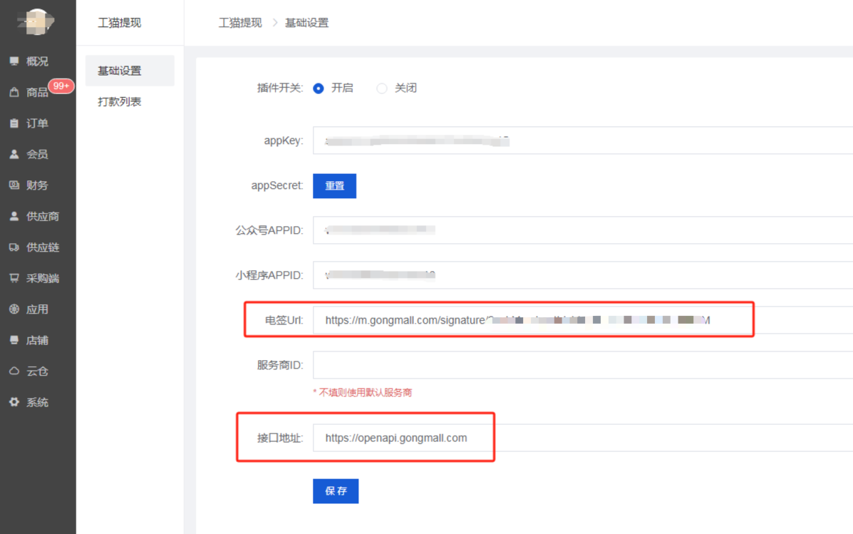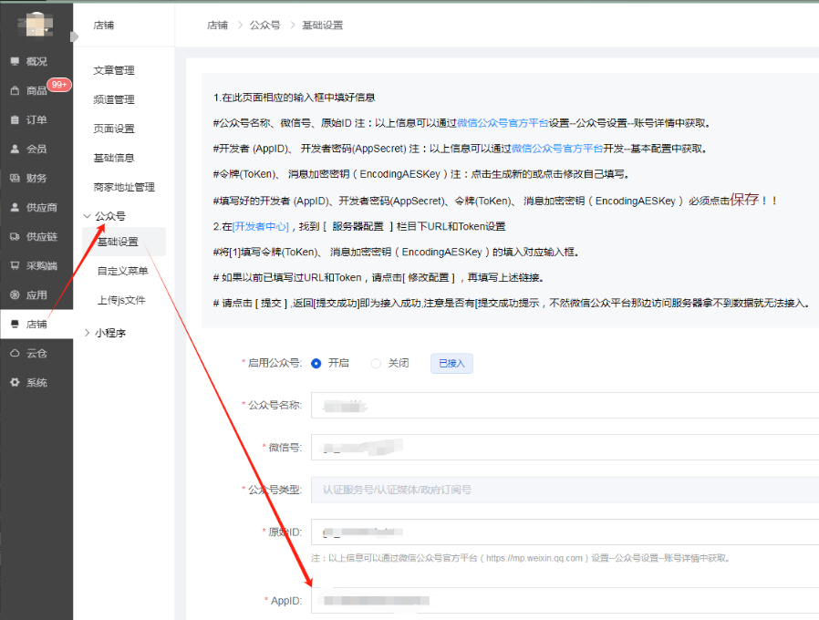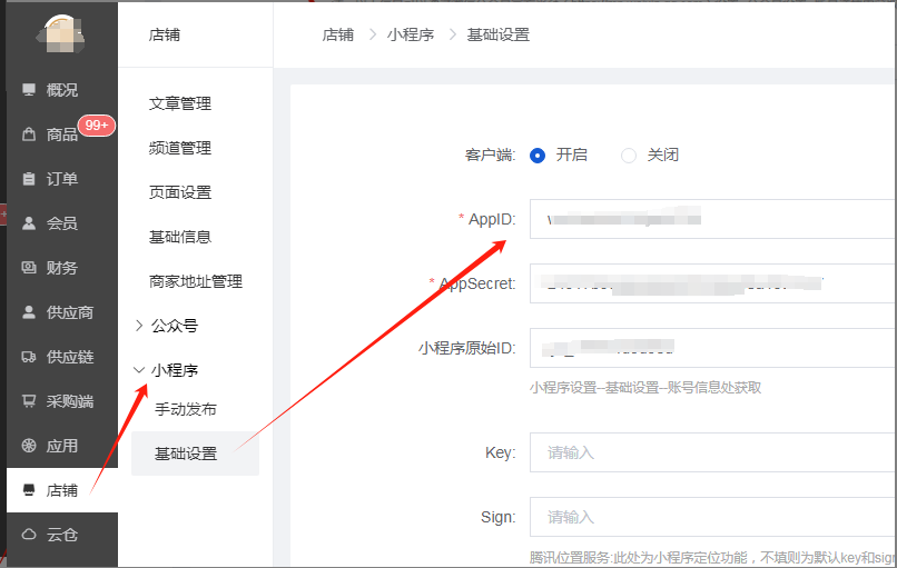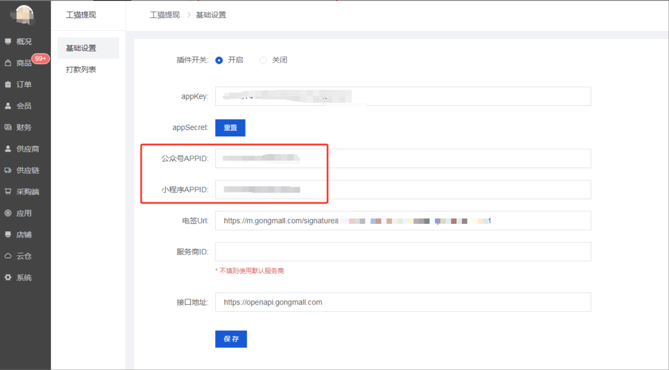 2、公众号appid、小程序appid、可以在店铺--公众号、小程序基础设置里复制到
