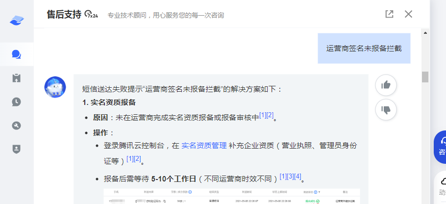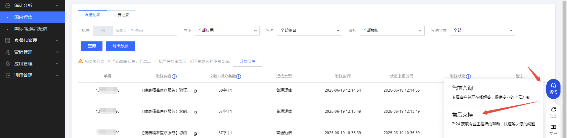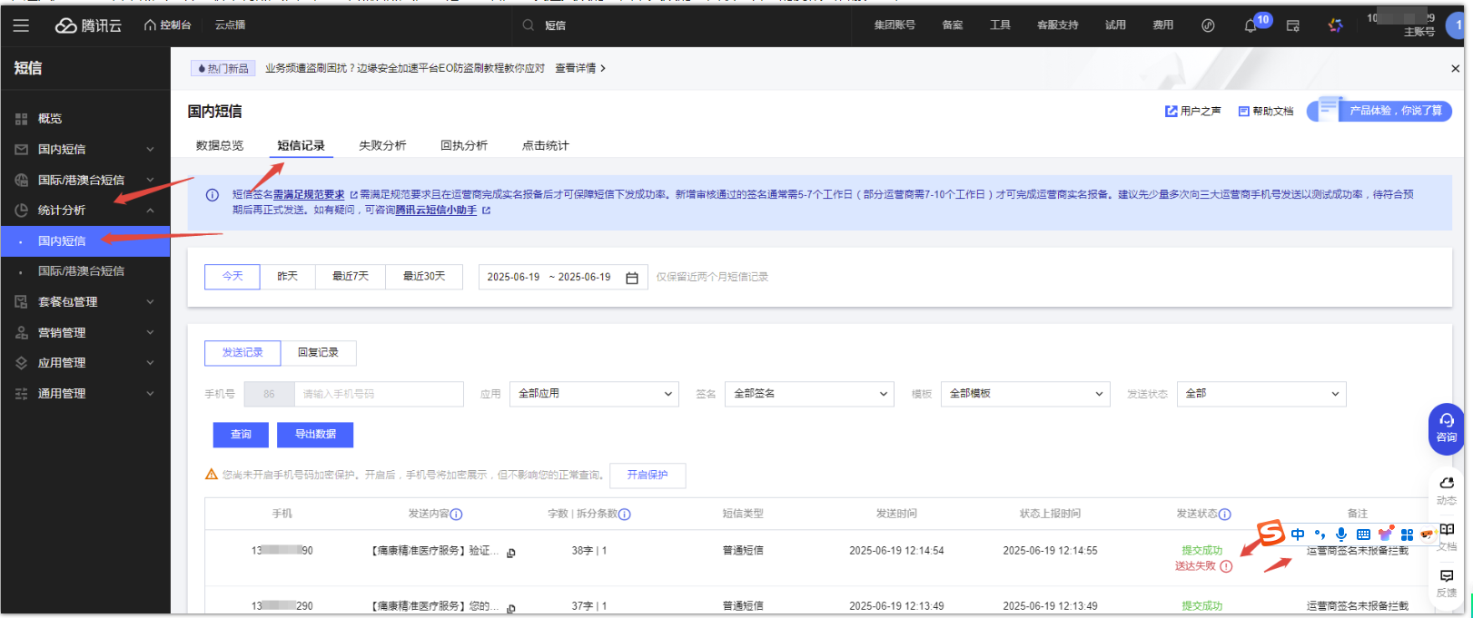 3、进入短信控制台,点击统计分析,再点击国内短信,然后点击短信记录查看短信发送失败的原因,把失败的原因联系官方的腾讯云客服协助处理并且告知已经已经在运营商完成实名资质报备