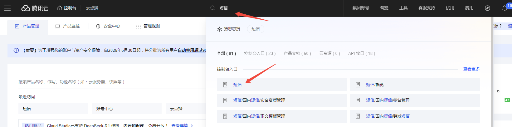 2、登录之后,点击右上角,进入控制台,在控制台的搜索栏,搜索短信,进度短信控制台