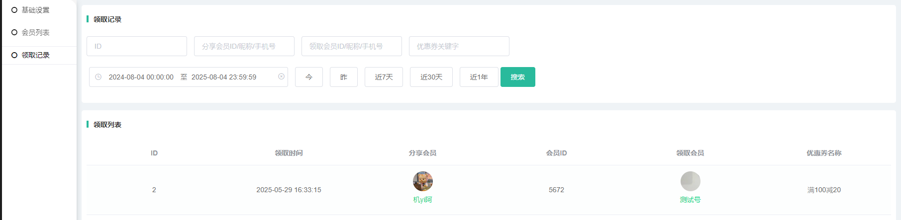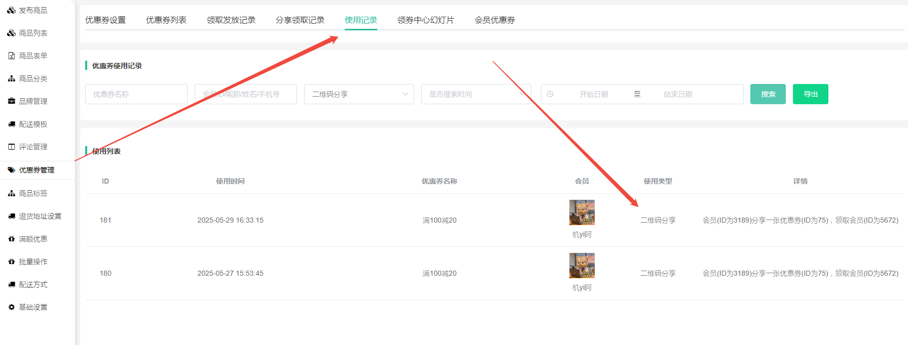 3,领取记录:会员生成优惠券分享码,其他会员领取后的记录