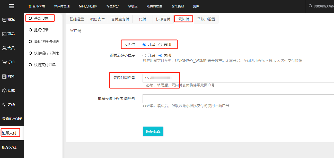 汇聚支付 → 基础设置 → 云闪付 → 云闪付商户号 处填写 报备商户号