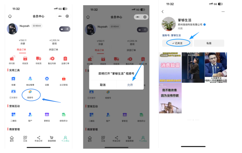小程序 → 会员中心 → 视频号 → 允许 → 点击关注(关注后会显示“已关注”)