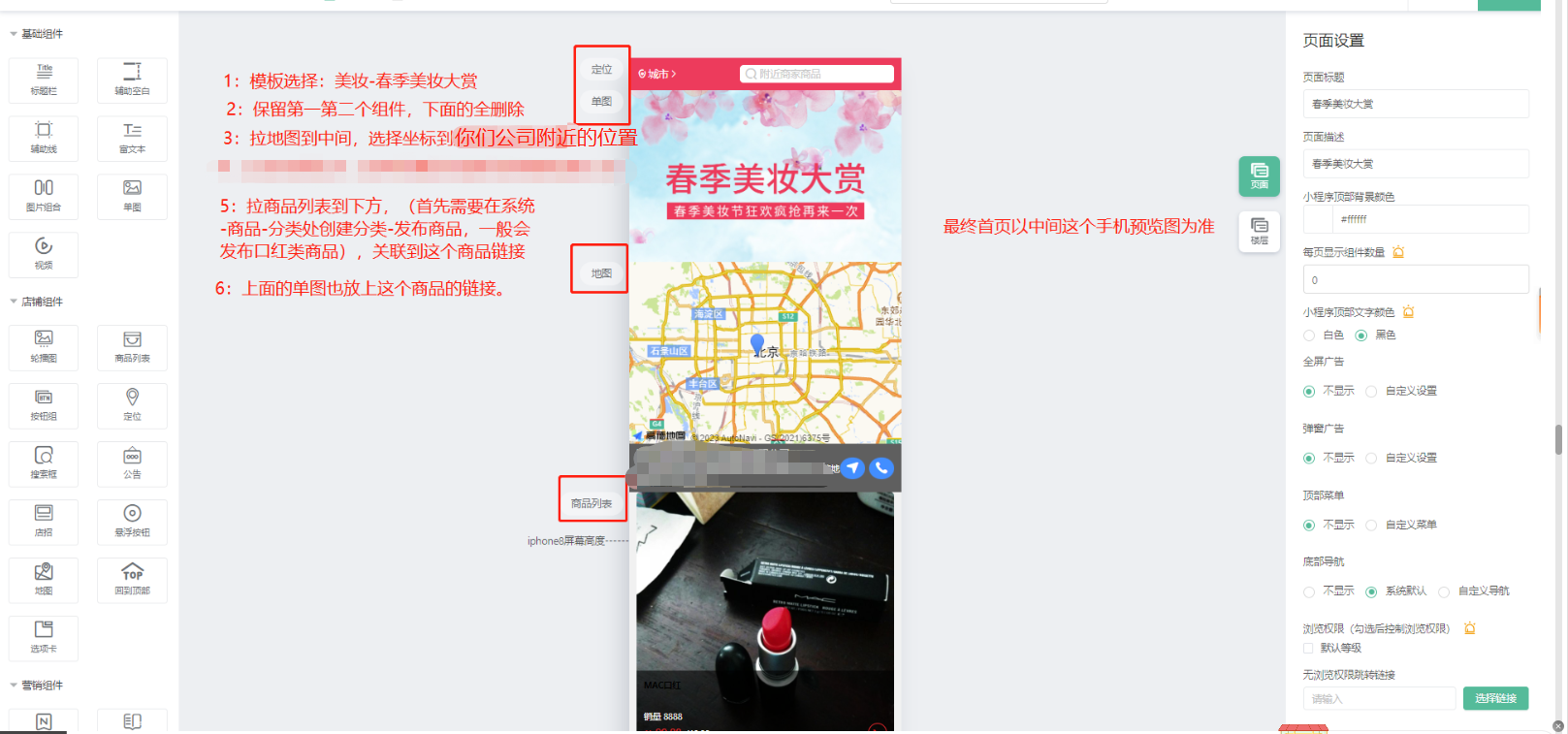 接口审核通过之后,需要回到后台,把审核页面里面的定位组件删掉,只留单图和一个商品,商品模板需要选择第二个
