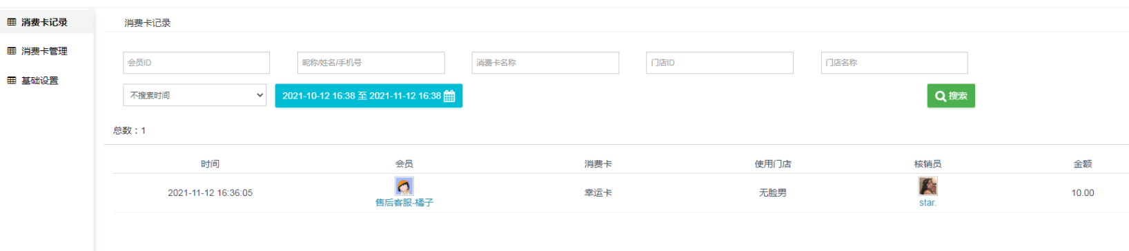 (2)购买商品可以一次性赠送多张消费卡,同时会员使用后消费金额可归入门店店长收入内,可进行提现,门店不用担心亏损。